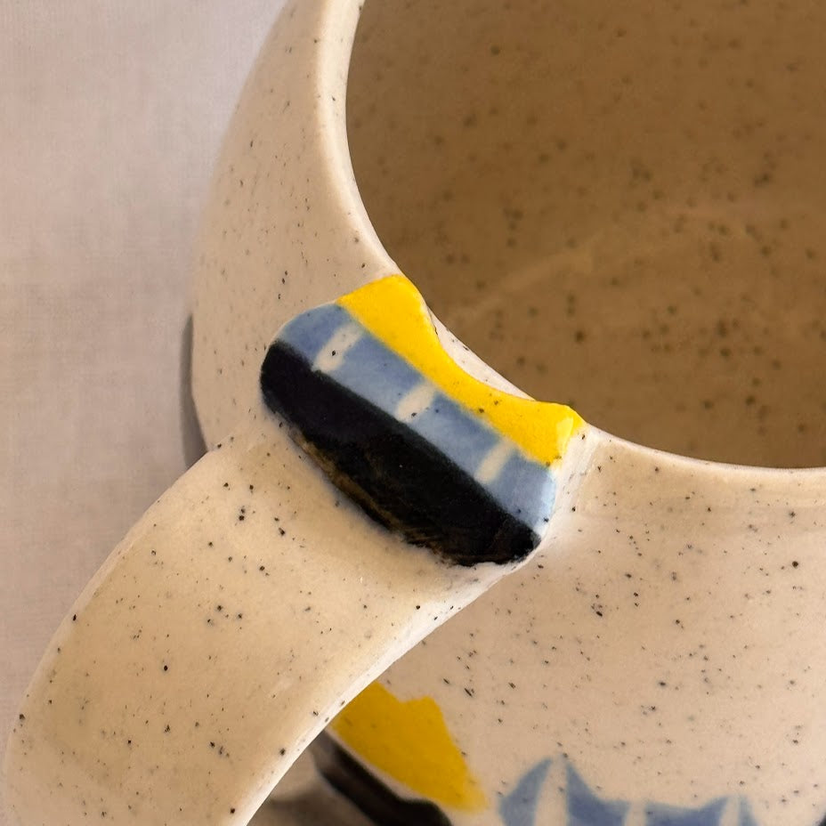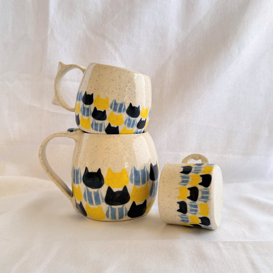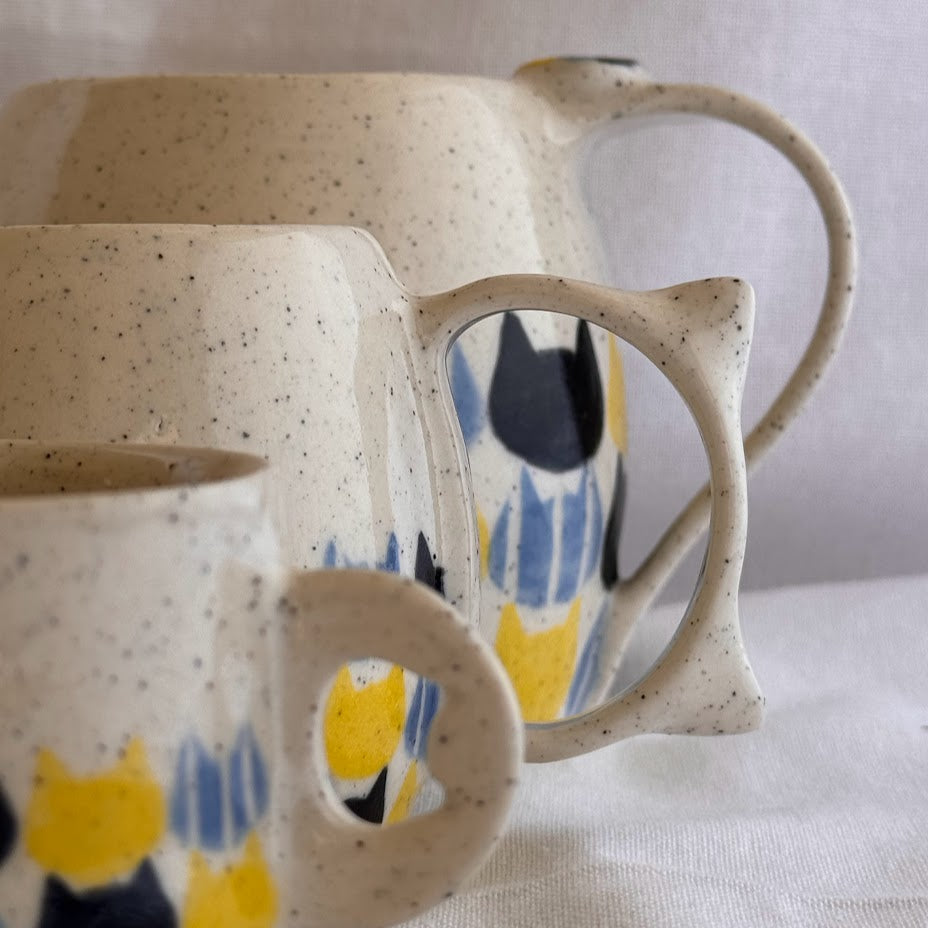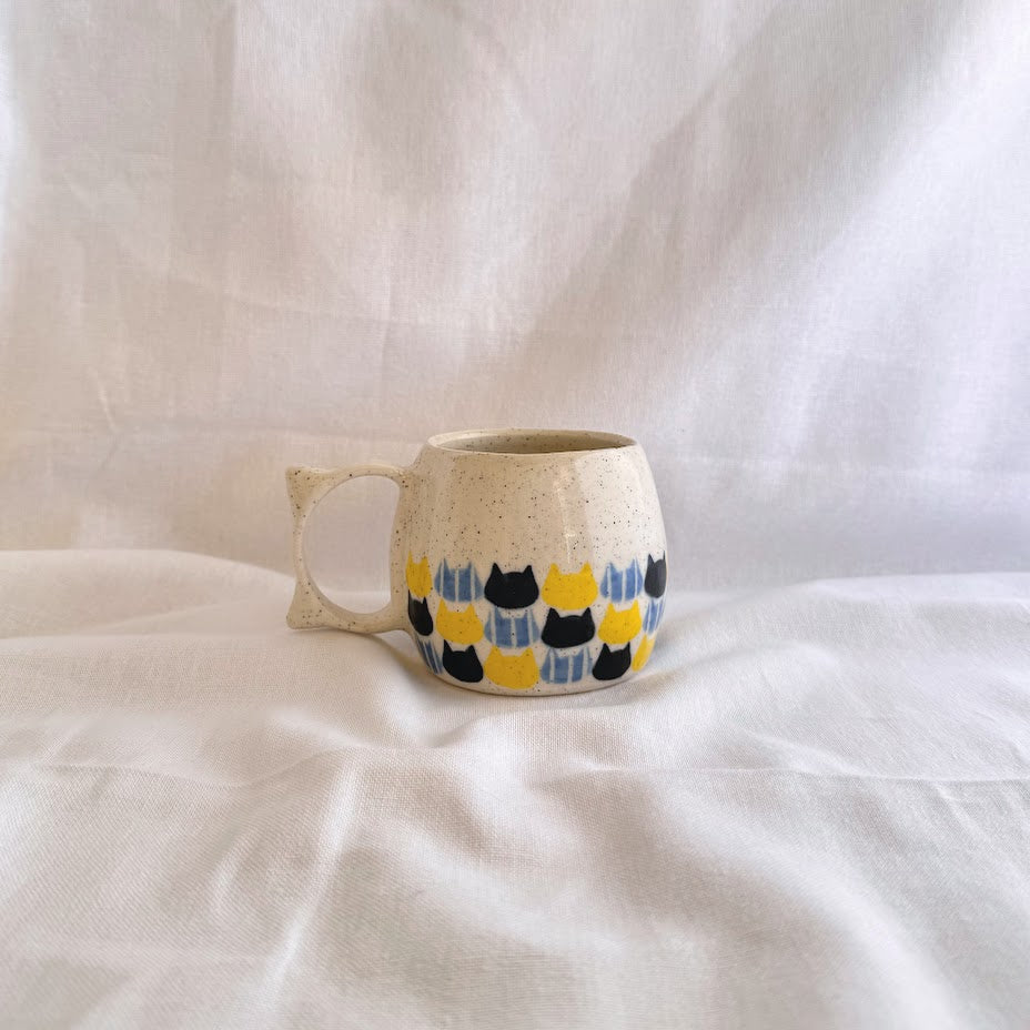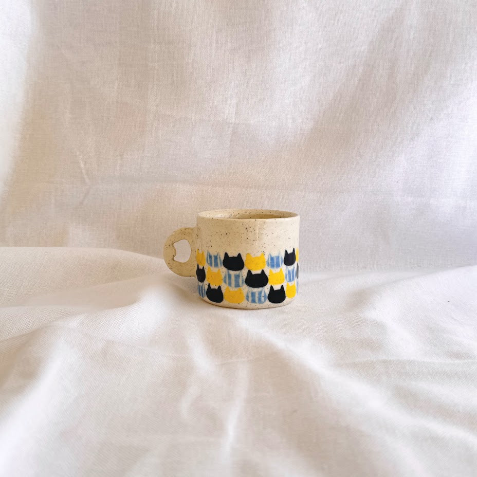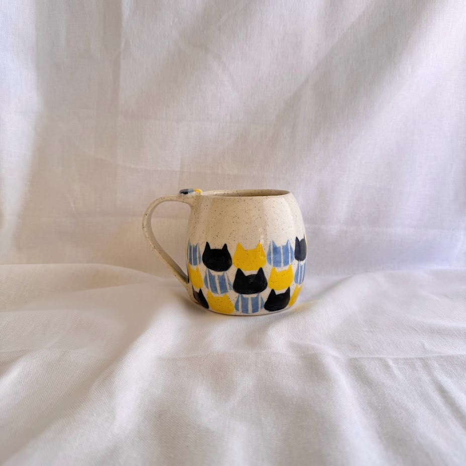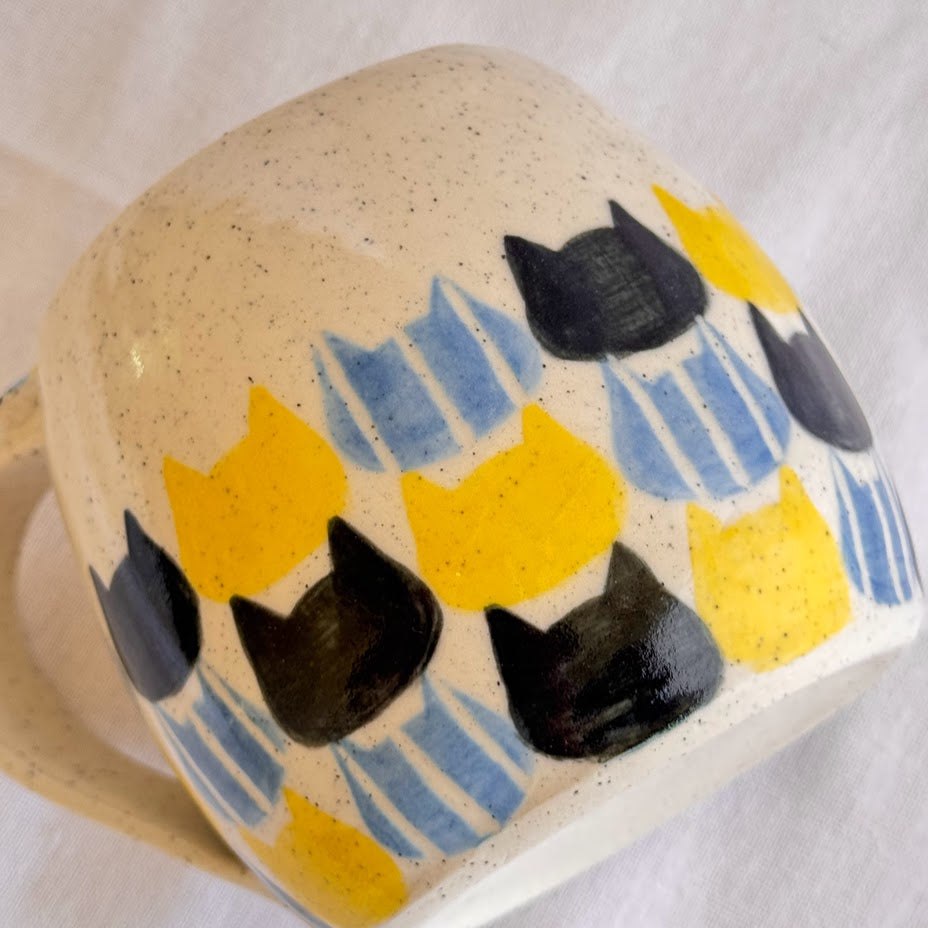Handmade and hand-painted checkered cat pattern on Stoneware clay.