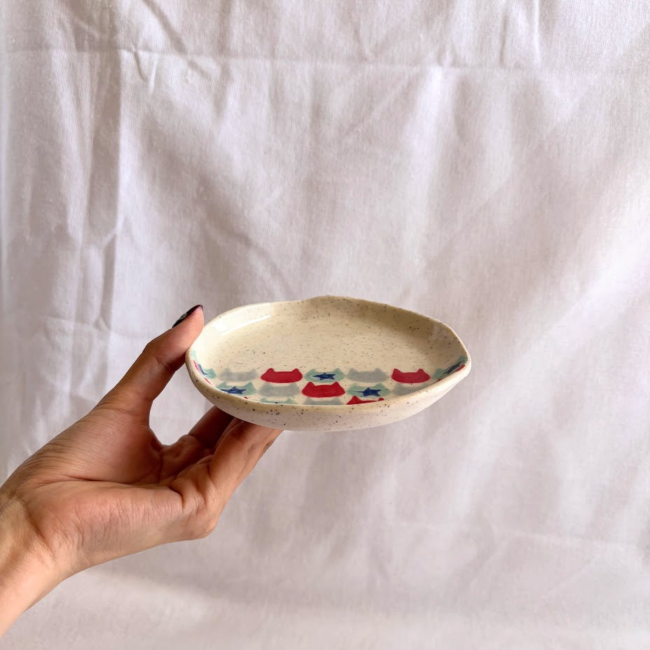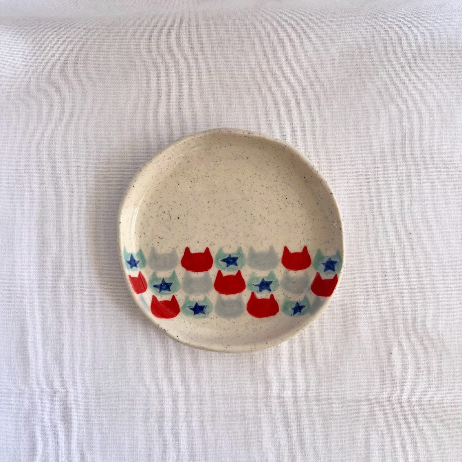 Handmade and hand-painted checkered cat pattern on Stoneware clay.